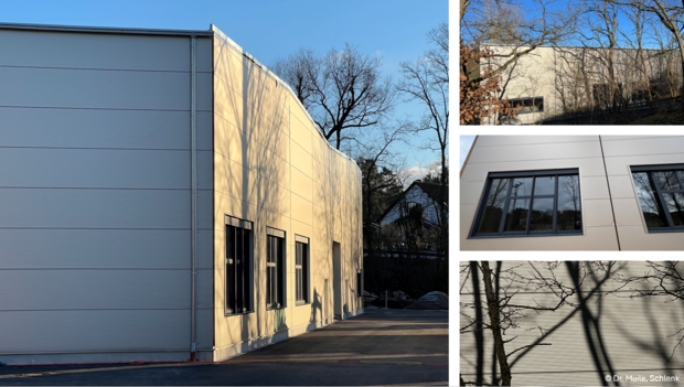 This groundbreaking pigment technology, honored with the Bavarian Innovation Award 2022, was previously utilized for the Technical Building 101 at the Barnsdorf site (colored façade in picture below). For this project, the “Franconian Pine Bark” color was selected, blending harmoniously with the surrounding forest and reflecting Schlenk SE’s commitment to sustainability.