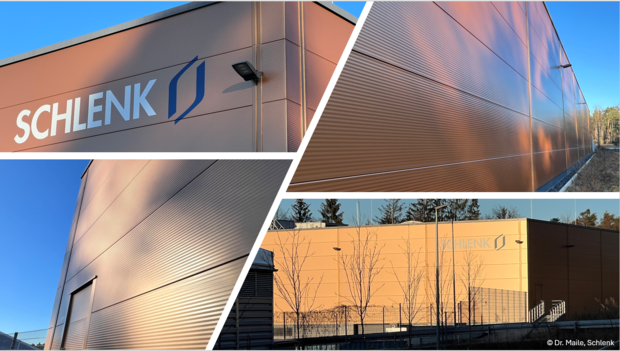 Schlenk SE, comprising Schlenk Metallic Pigments and Schlenk Metal Foils, has once again demonstrated its collaborative expertise in combining technological innovation with aesthetic excellence. The new shipping hall at the Bernlohe site features a champagne-colored coil coating shade, “GoldenWhite Robinia”, which, thanks to the award-winning Zenexo® Pigment Technology, exudes an impressive metallic brilliance. The facade maintains its striking appearance under both direct sunlight and diffuse lighting, lending the building an elegant and modern aura.