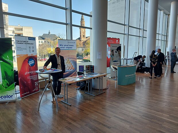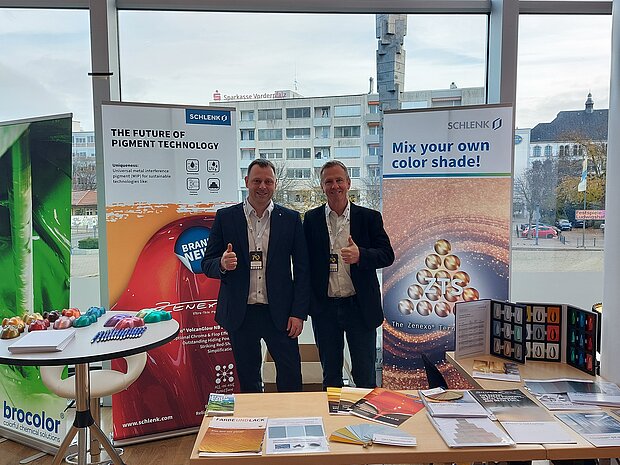 The SCHLENK booth attracted a great deal of interest, especially during the breaks between presentations. In addition to personal exchanges, visitors from various fields of application and students were given an overview of the pigment portfolio. A special focus was placed on the presentation of the product innovation Zenexo® VolcanGlow NB 21 OR.